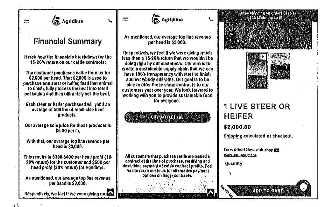 While the records don’t explain how the two men became business partners, their concept, on paper, sounded plausible: a way for investors to profit from cattle without doing the physical labor, while ostensibly supporting local agriculture. On its website, Agridime proclaimed “PRODUCING THE BEST MEAT FOR THE BEST PRICE. RAISED BY AMERICAN FARMERS,” with the text appearing over an image of a woman on horseback, in a cowboy hat, carrying a large American flag.