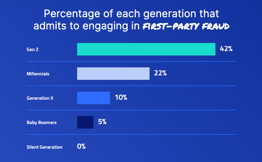 The themes landed even deeper. More socially conscious than Millennials, Gen Zers are also more OK with stealing from “evil corporations.” A fraud prevention company published survey data showing that 42% of Gen Zers (almost half!!) have lied to a credit card firm about their purchases to get charges wiped off their accounts. Meanwhile, 22% of Millennials have done the same. For Gen X, the number was 10%, and for Baby Boomers it was 5%.