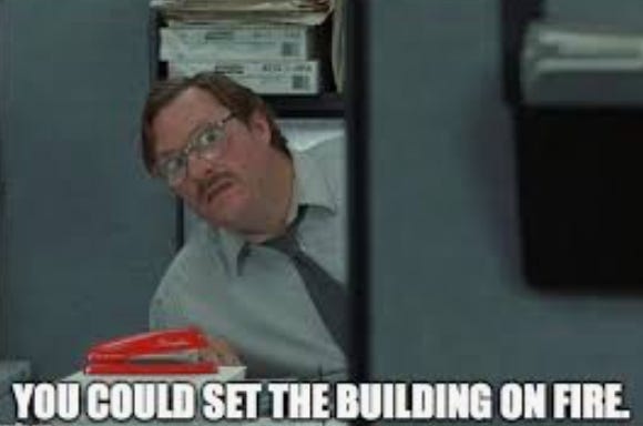 In another memorable exchange, the characters fret over whether they might go to a “white collar resort” or “federal pound me in the a** prison” when their crime is discovered. But they don’t end up in either. Their tracks are covered by a colleague, Milton the Stapler Guy, coming mentally unhinged and burning down the office building