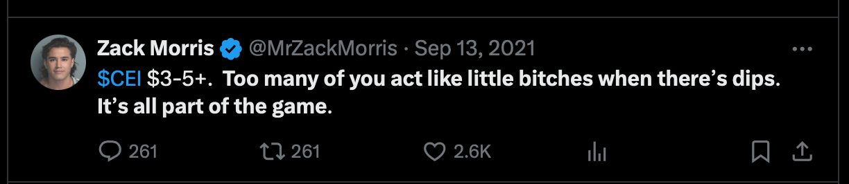 The deepest pockets in the crew, Constantinescu bought about 2 million shares for $1 million, or about 50 cents per share. For a month, he tweeted increasingly ambitious expectations for the stock — first claiming a target of $3-$5 per share, and then raising his purported target to $10. He encouraged his followers with tweets like “Too many of you act like little bitches when there’s dips. It’s all part of the game.”