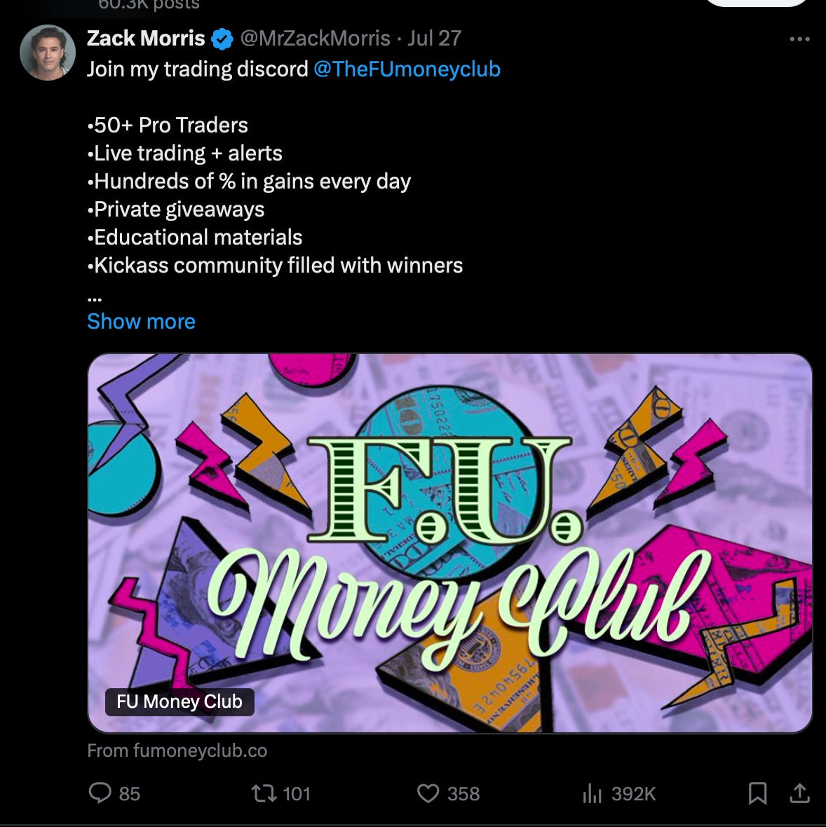 Meanwhile “Zack” is back to doing his thing, talking up stocks and posting memes and gifs on X. He also launched a new Discord-based trading chat room: the “F.U. Money Club.”