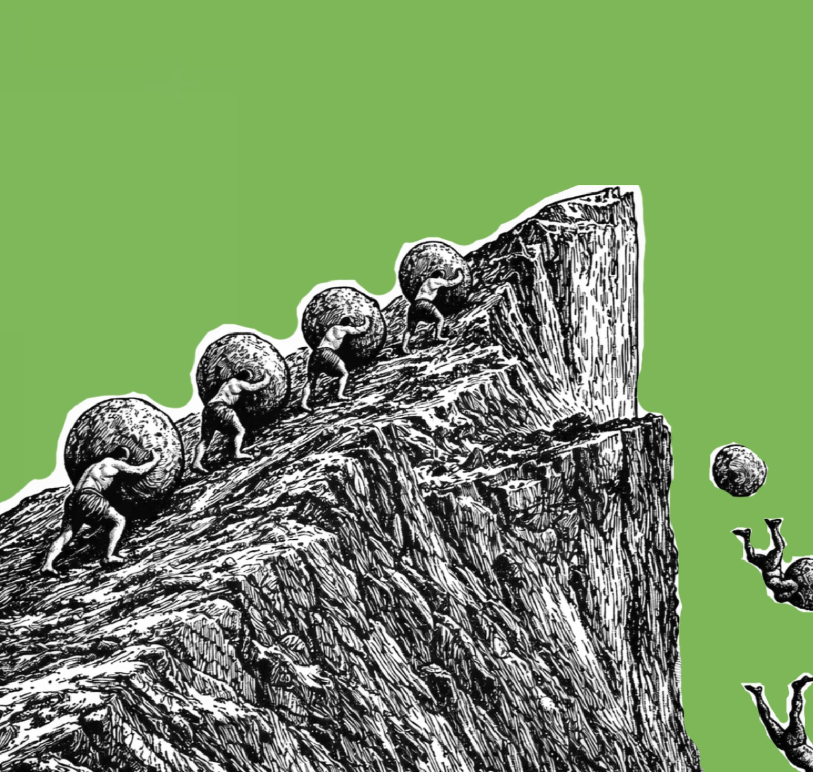 An AI-generated image of people rolling boulders up a mountain and falling off a cliff.