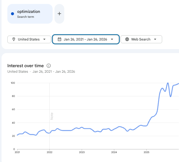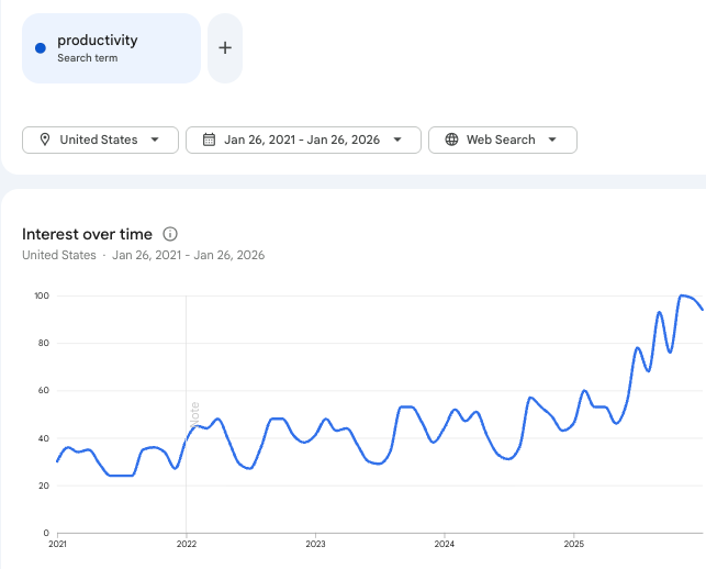 Lest you think I’m imagining things, there is data to support these notions sinking into our collective consciousness. Take Google Trends: searches for the word “productivity” are roughly four times higher than they were five years ago—an astonishing trajectory for such a boring term, especially considering how much chatbots have recently eaten away at traditional search volume.